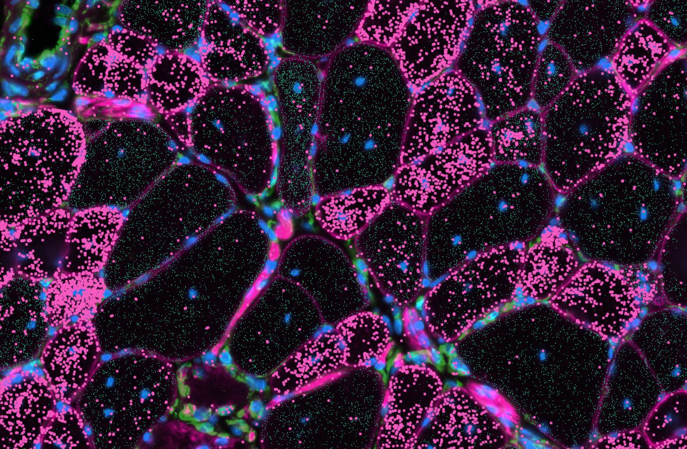 Het antwoord ligt verstopt in de spieren zelf. Maar hoe kijk je daarin? Traditioneel onderzoek meet gemiddelden: hoeveel dystrofine zit er gemiddeld in een stukje spierweefsel? Dat vertelt je echter niet wat er in elke individuele spiercel gebeurt. Daarom gebruikt Pietro een revolutionaire techniek: spatial transcriptomics. Deze methode kan in een plakje spierweefsel aflezen welke genen in elke cel actief zijn. Het is alsof je een microscoop hebt die kan lezen wat elke cel aan het doen is.